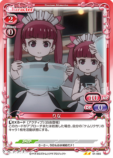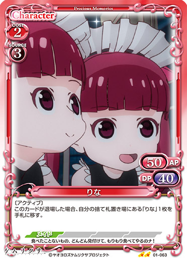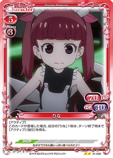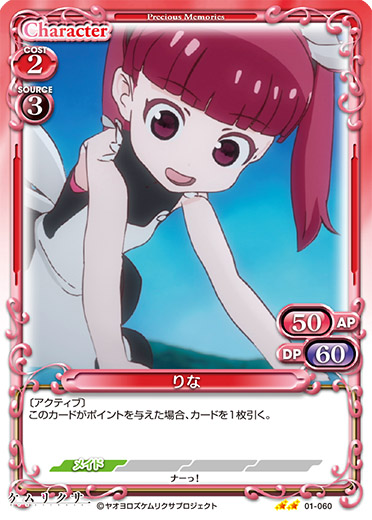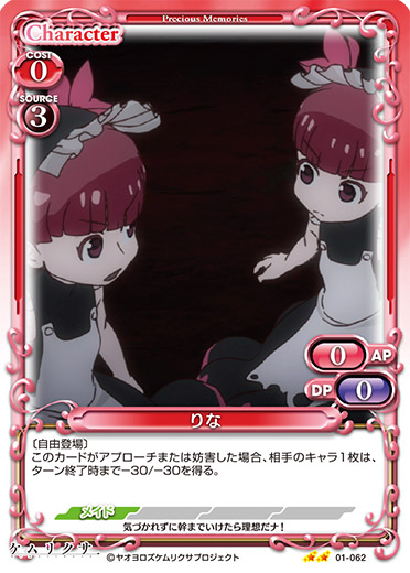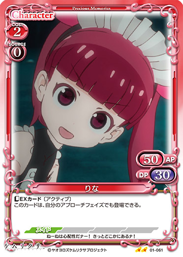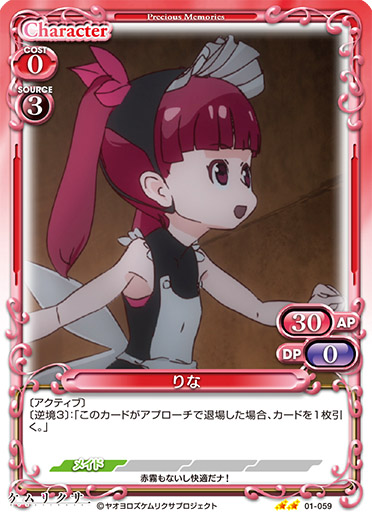 | 〔アクティブ〕このカードが退場した場合、自分の捨て札置き場にある「りな」1枚を手札に移す。 | ||