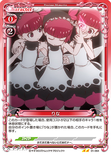 | このカードが登場した場合、使用コストが2以下の相手のキャラ1枚を休息状態にする。自分のポイント置き場に「りな」が置かれた場合、このカードを手札に移す。 | ||