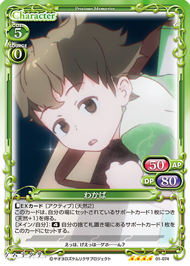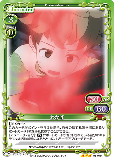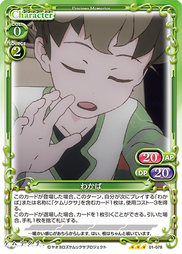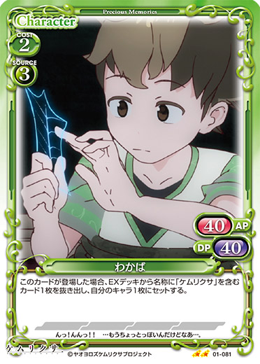 | このカードが登場した場合、EXデッキから「わかば」または名称に「ケムリクサ」を含むカード1枚を抜き出し、手札に移す。[メイン/相手]:《休》サポートカードがセットされている自分のキャラ1枚を活動状態にする。その場合、このカードを捨て札にする。 | ||