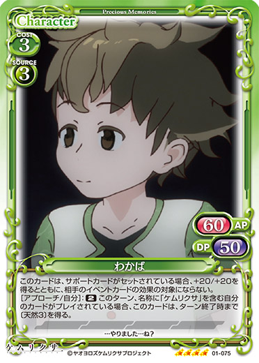 | このカードは、サポートカードがセットされている場合、+20/+20を得るとともに、相手のイベントカードの対象にならない。[アプローチ/自分]:《2》このターン、名称に「ケムリクサ」を含む自分のカードがプレイされている場合、このカードは、ターン終了時まで〔天然3〕を得る。 | ||