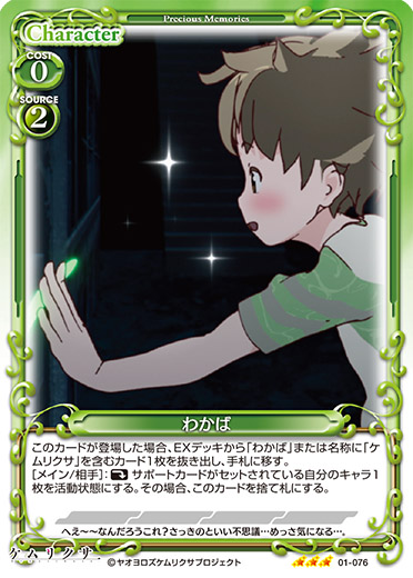 | このカードが登場した場合、EXデッキから名称に「ケムリクサ」を含むカード1枚を抜き出し、自分のキャラ1枚にセットする。 | ||