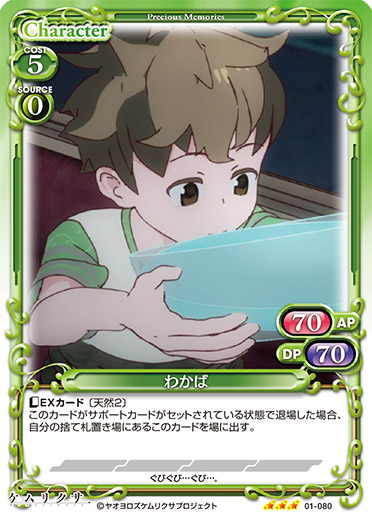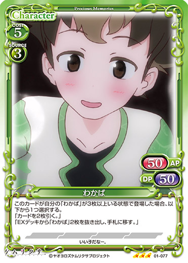 | このカードが自分の「わかば」が3枚以上いる状態で登場した場合、以下から1つ選択する。「カードを2枚引く。」「EXデッキから「わかば」2枚を抜き出し、手札に移す。」 | ||