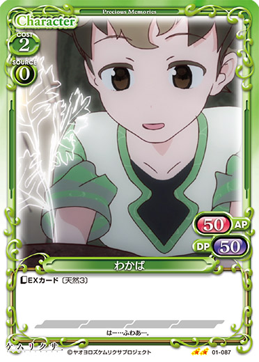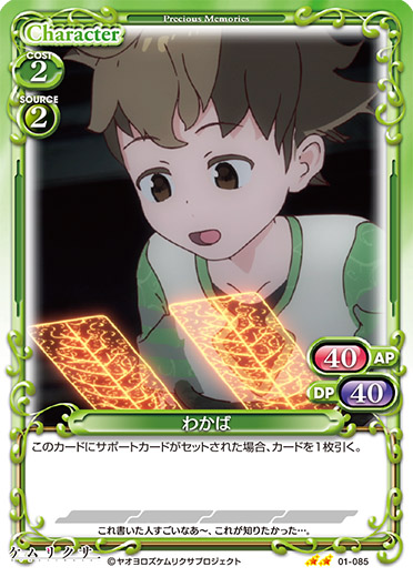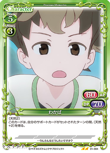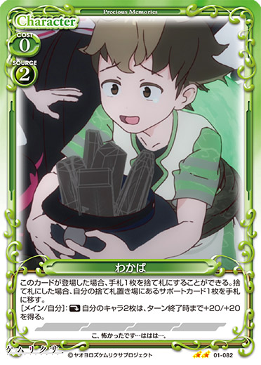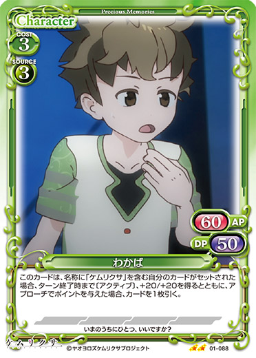 | このカードは、名称に「ケムリクサ」を含む自分のカードがセットされた場合、ターン終了時まで〔アクティブ〕、+20/+20を得るとともに、アプローチでポイントを与えた場合、カードを1枚引く。 | ||