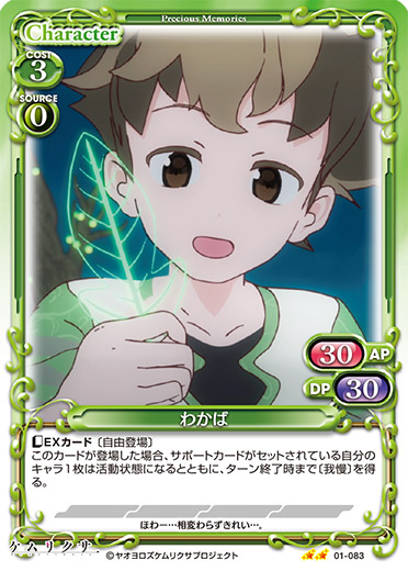 | 〔EXカード〕〔自由登場〕このカードが登場した場合、サポートカードがセットされている自分のキャラ1枚は活動状態になるとともに、ターン終了時まで〔我慢〕を得る。 | ||