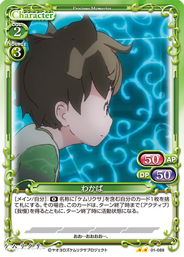 | [メイン/自分]:《0》名称に「ケムリクサ」を含む自分のカード1枚を捨て札にする。その場合、このカードは、ターン終了時まで〔アクティブ〕〔我慢〕を得るとともに、ターン終了時に活動状態になる。 | ||