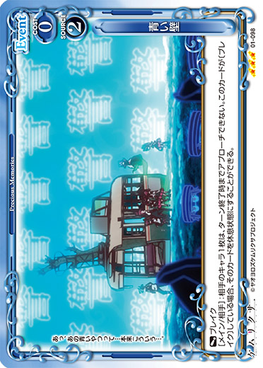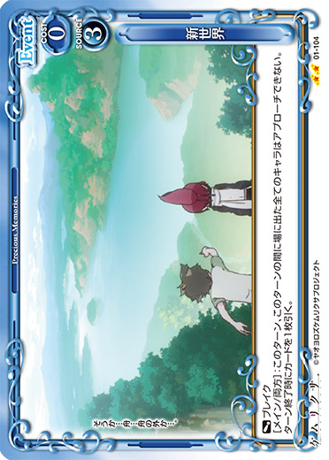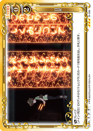 | 〔ブレイク〕[メイン/両方]:このターン、このターンの間に場に出た全てのキャラはアプローチできない。ターン終了時にカードを1枚引く。 | ||