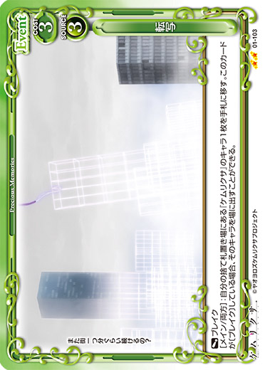 | 〔ブレイク〕[メイン/相手]:相手のキャラ1枚は、ターン終了時までアプローチできない。このカードが〔ブレイク〕している場合、そのカードを休息状態にすることができる。 | ||