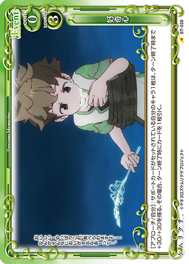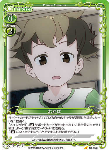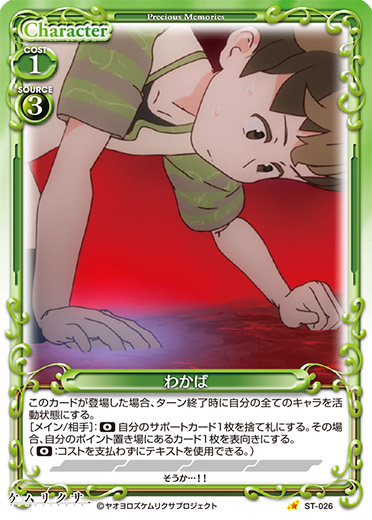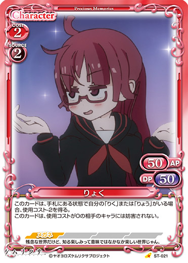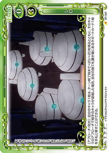 | このカードは、手札にある状態で自分の「りく」または「りょう」がいる場合、使用コスト-2を得る。このカードは、使用コストが0の相手のキャラには妨害されない。 | ||