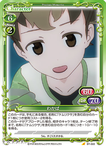| このカードは、手札にある場合、名称に「ケムリクサ」を含む自分のカード1枚につき使用コスト-2を得る。このカードがアプローチした場合、相手のキャラ1枚は、ターン終了時まで、名称に「ケムリクサ」を含む自分のカード1枚につき-10/-10を得る。 | ||