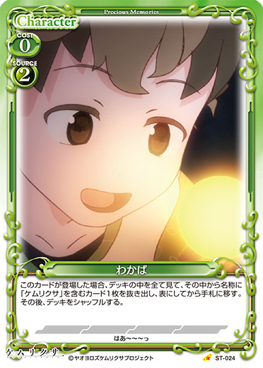 | このカードが登場した場合、デッキの中を全て見て、その中から名称に「ケムリクサ」を含むカード1枚を抜き出し、表にしてから手札に移す。その後、デッキをシャッフルする。 | ||