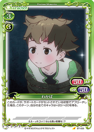 | このカードが、サポートカードがセットされている状態でアプローチした場合、このターン、自分の全てのキャラは+20/+20を得る。 | ||