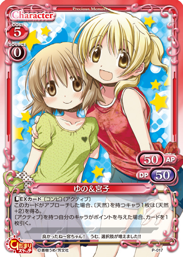 | 〔EXカード〕〔コンビ〕〔アクティブ〕このカードがアプローチした場合、〔天然〕を持つキャラ1枚は〔天然+2〕を得る。〔アクティブ〕を持つ自分のキャラがポイントを与えた場合、カードを1枚引く。 | ||