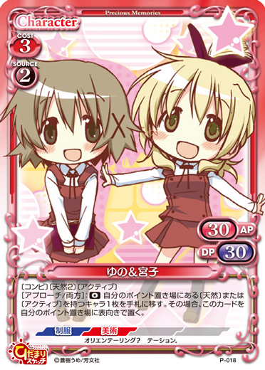 | 〔コンビ〕〔天然2〕〔アクティブ〕[アプローチ/両方]:《0》自分のポイント置き場にある〔天然〕または〔アクティブ〕を持つキャラ1枚を手札に移す。その場合、このカードを自分のポイント置き場に表向きで置く。 | ||