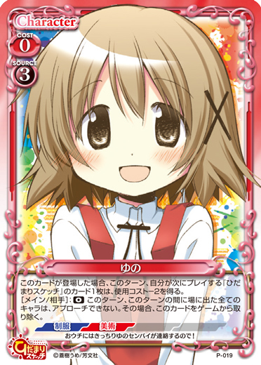 | このカードが登場した場合、このターン、自分が次にプレイする『ひだまりスケッチ』のカード1枚は、使用コスト-2を得る。[メイン/相手]:《0》このターン、このターンの間に場に出た全てのキャラは、アプローチできない。その場合、このカードをゲームから取り除く。 | ||