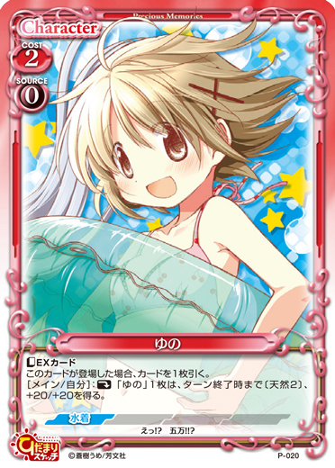 | 〔EXカード〕このカードが登場した場合、カードを1枚引く。[メイン/自分]:《休》「ゆの」1枚は、ターン終了時まで〔天然2〕、+20/+20を得る。 | ||