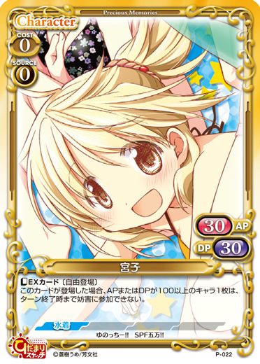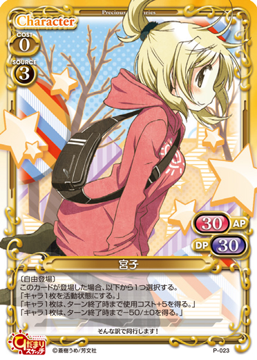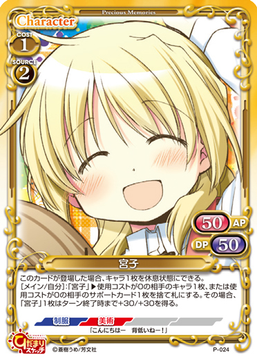 | このカードが登場した場合、キャラ1枚を休息状態にできる。[メイン/自分]:「宮子」▶使用コストが0の相手のキャラ1枚、または使用コストが0の相手のサポートカード1枚を捨て札にする。その場合、「宮子」1枚はターン終了時まで+30/+30を得る。 | ||