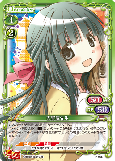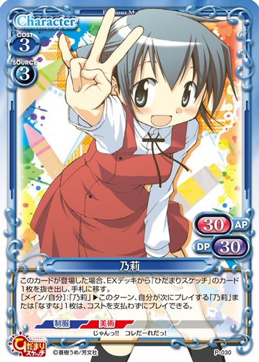 | このカードが登場した場合、EXデッキから『ひだまりスケッチ』のカード1枚を抜き出し、手札に移す。[メイン/自分]:「乃莉」▶このターン、自分が次にプレイする「乃莉」または「なずな」1枚は、コストを支払わずにプレイできる。 | ||
