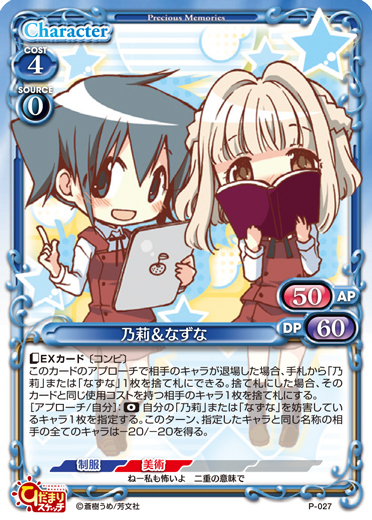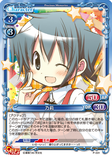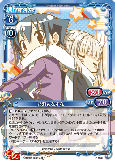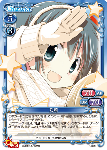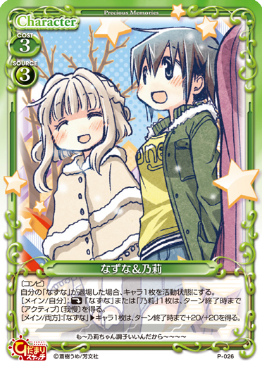 | 〔アクティブ〕このカードがアプローチで退場した場合、自分の捨て札置き場にあるこのカード以外の「乃莉」または「なずな」1枚を休息状態で場に出す。ターン終了時にそのキャラを活動状態にする。このカードがポイントを与えた場合、ターン終了時に自分の全てのキャラを活動状態にする。 | ||