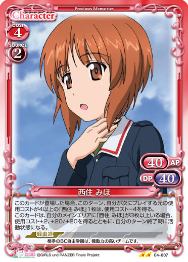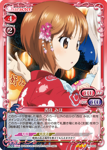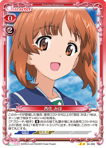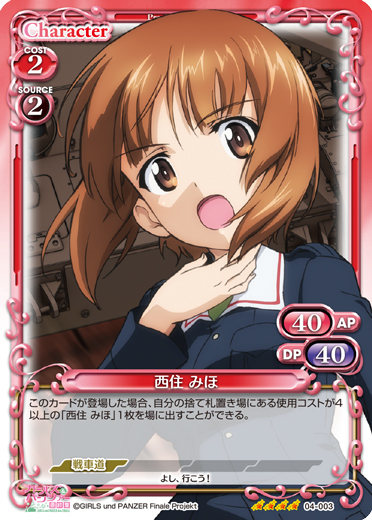 | このカードが登場した場合、このターン、自分が次にプレイする元の使用コストが4以上の「西住 みほ」1枚は、使用コスト-4を得る。このカードは、自分のメインエリアに「西住 みほ」が3枚以上いる場合、使用コスト+2、+20/+20を得るとともに、自分のターン終了時に活動状態になる。 | ||