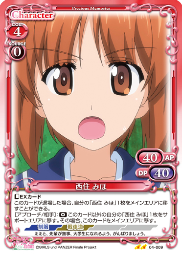 | このカードが登場した場合、使用コストが4以上の「西住 みほ」1枚は、ターン終了時まで+40/+40を得る。[アプローチ/相手]:《4》自分の捨て札置き場にある使用コストが4以上の「西住 みほ」1枚をサポートエリアに出す。その場合、このカードを捨て札にする。 | ||