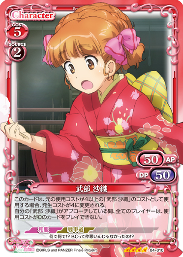 | このカードは、元の使用コストが4以上の「武部 沙織」のコストとして使用する場合、発生コストが4に変更される。自分の「武部 沙織」がアプローチしている間、全てのプレイヤーは、使用コストが0のカードをプレイできない。 | ||