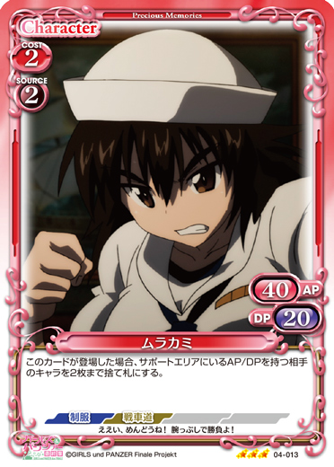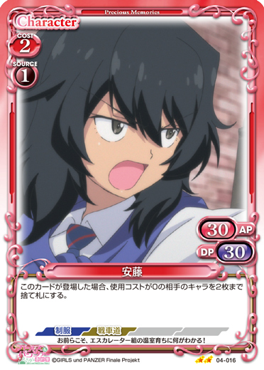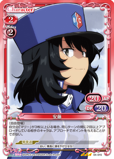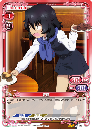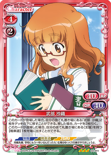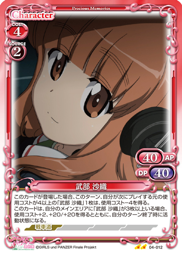 | このカードが登場した場合、このターン、自分が次にプレイする元の使用コストが4以上の「武部 沙織」1枚は、使用コスト-4を得る。このカードは、自分のメインエリアに「武部 沙織」が3枚以上いる場合、使用コスト+2、+20/+20を得るとともに、自分のターン終了時に活動状態になる。 | ||