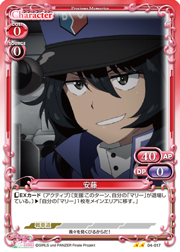 | このカードが登場した場合、自分の捨て札置き場にある「武部 沙織」2枚をデッキの下に移すことができる。移した場合、カードを2枚引く。このカードが退場した場合、自分の捨て札置き場にある〔支援〕を持つ【戦車道】1枚を場に出すことができる。 | ||