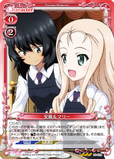 | 〔コンビ〕このカードが登場した場合、EXデッキから「マリー」または「安藤」または〔支援〕を持つ【戦車道】1枚を抜き出し、手札に移す。[メイン/相手]:《休》自分の「マリー」1枚を活動状態にする。その場合、このカードを捨て札にする。 | ||