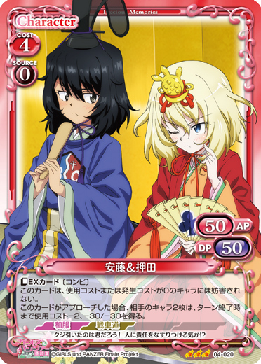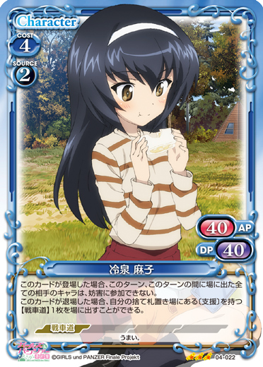 | このカードが登場した場合、このターン、このターンの間に場に出た全ての相手のキャラは、妨害に参加できない。このカードが退場した場合、自分の捨て札置き場にある〔支援〕を持つ【戦車道】1枚を場に出すことができる。 | ||