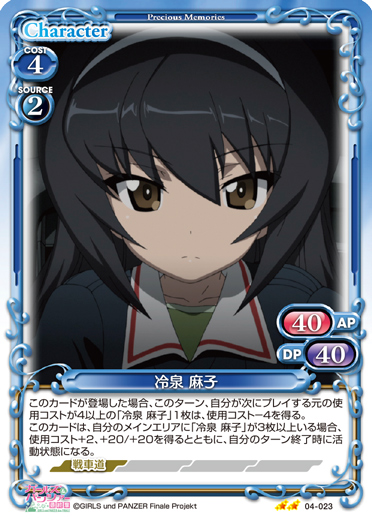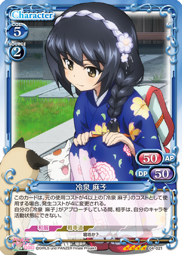 | このカードが登場した場合、このターン、自分が次にプレイする元の使用コストが4以上の「冷泉 麻子」1枚は、使用コスト-4を得る。このカードは、自分のメインエリアに「冷泉 麻子」が3枚以上いる場合、使用コスト+2、+20/+20を得るとともに、自分のターン終了時に活動状態になる。 | ||