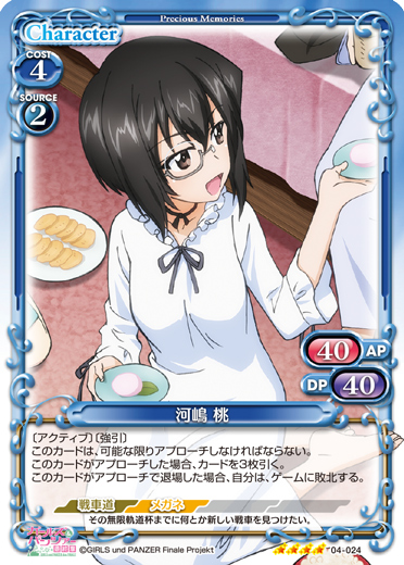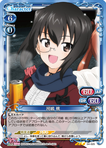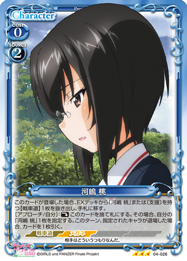 | このカードが登場した場合、EXデッキから「河嶋 桃」または〔支援〕を持つ【戦車道】1枚を抜き出し、手札に移す。[アプローチ/自分]:《休》このカードを捨て札にする。その場合、自分の「河嶋 桃」1枚を指定する。このターン、指定されたキャラが退場した場合、カードを1枚引く。 | ||
