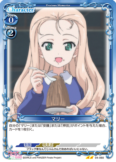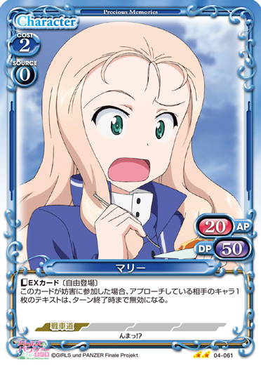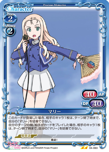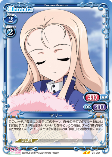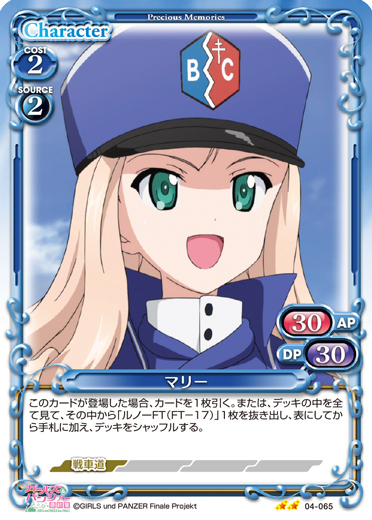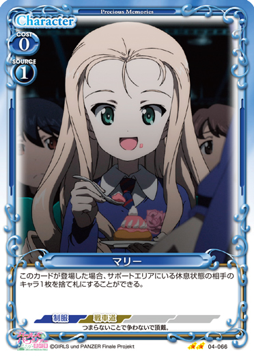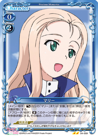 | このカードが登場した場合、相手のキャラ1枚は、ターン終了時まで、自分の「マリー」を妨害できない。自分のターンの間、相手がカードをプレイした場合、相手のキャラ1枚は、ターン終了時まで、自分の「マリー」を妨害できない。 | ||
