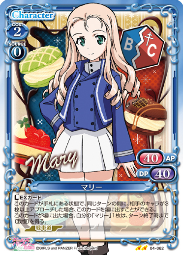 | 〔EXカード〕このカードが手札にある状態で、同じターンの間に、相手のキャラが3枚以上アプローチした場合、このカードを場に出すことができる。このカードが場に出た場合、自分の「マリー」1枚は、ターン終了時まで〔我慢〕を得る。 | ||