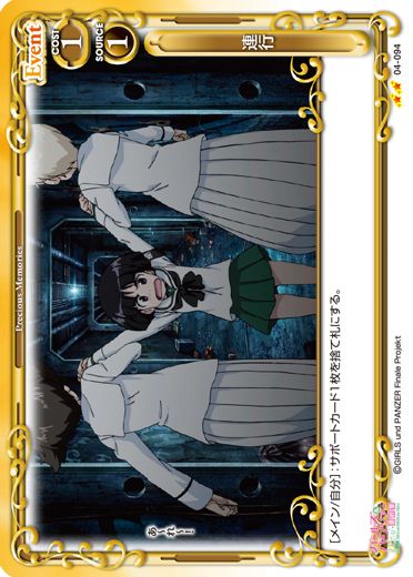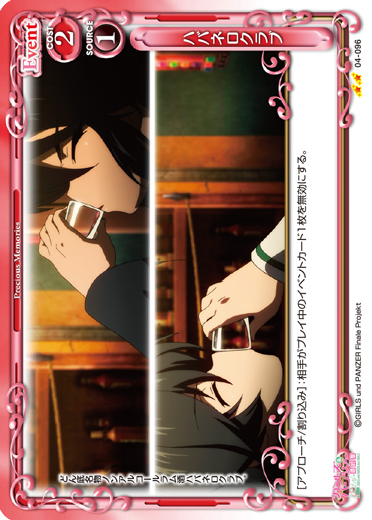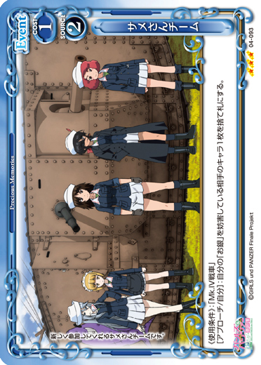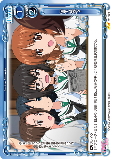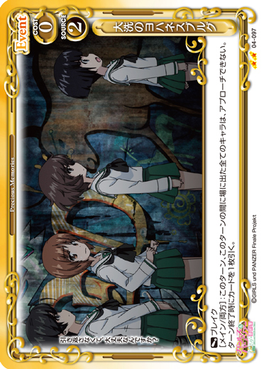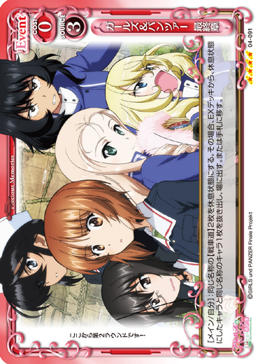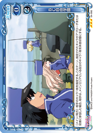 | [メイン/自分]:同じ名称の【戦車道】2枚を休息状態にする。その場合、EXデッキから、休息状態にしたキャラと同じ名称のキャラ1枚を抜き出し、場に出す。または手札に移す。 | ||