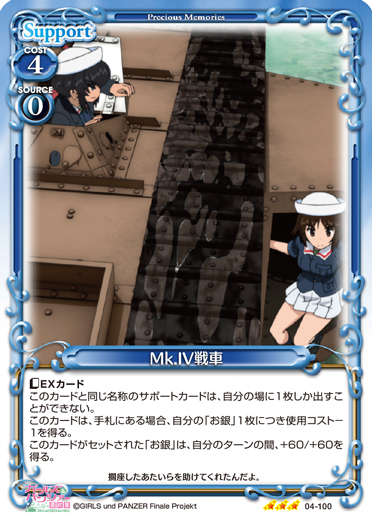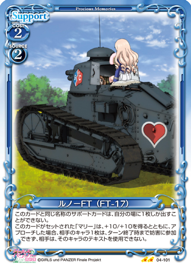 | このカードが登場した場合、このターン、自分が次にプレイする【戦車道】は使用コスト-3を得る。このカードが退場した場合、自分の捨て札置き場にある〔支援〕を持つ【戦車道】1枚をEXデッキに移す。 | ||