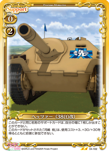 | このカードと同じ名称のサポートカードは、自分の場に1枚しか出すことができない。このカードがセットされた「河嶋 桃」は、使用コスト+3、+30/+30を得るとともに妨害に参加できない。 | ||