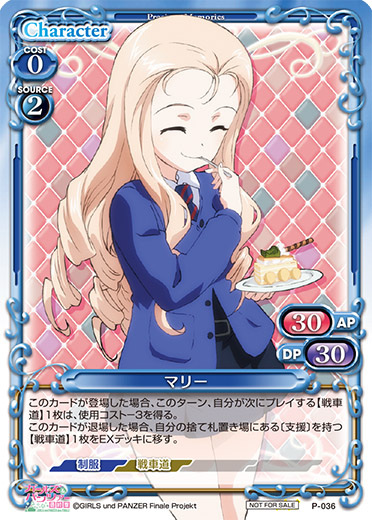 | このカードは、自分のターンの間、+20/+20を得る。このカードのアプローチで相手のキャラが退場した場合、手札にある使用コストが2以下の【戦車道】1枚を場に出すことができる。 | ||