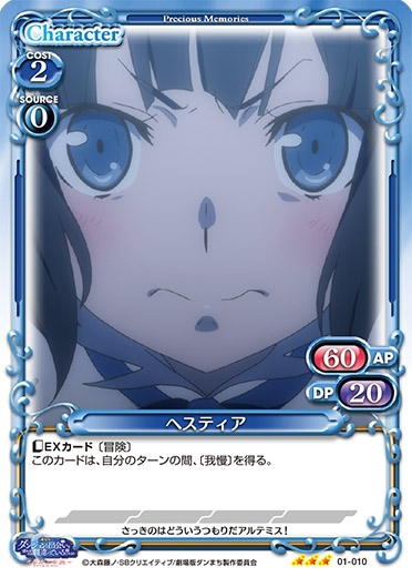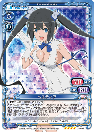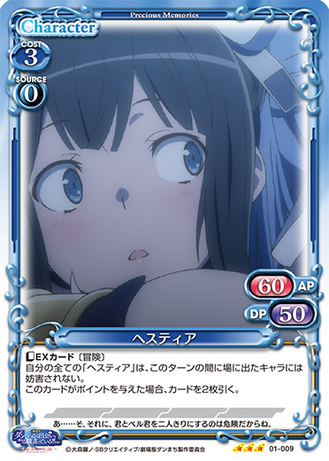 | 〔EXカード〕〔冒険〕自分の全ての「ヘスティア」は、このターンの間に場に出たキャラには妨害されない。このカードがポイントを与えた場合、カードを2枚引く。 | ||