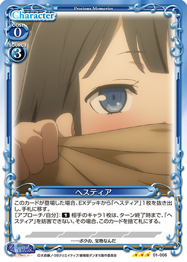 | このカードが登場した場合、EXデッキから「ヘスティア」1枚を抜き出し、手札に移す。[アプローチ/自分]:《1》相手のキャラ1枚は、ターン終了時まで、「ヘスティア」を妨害できない。その場合、このカードを捨て札にする。 | ||