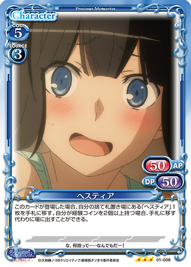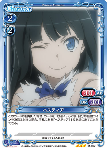 | 〔冒険〕〔アクティブ〕このカードが登場した場合、手札にある使用コストが3以下の 『ダンジョンに出会いを求めるのは間違っているだろうか』のキャラ1枚を場に出すことができる。このカードが退場した場合、カードを1枚引く。 | ||