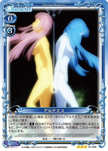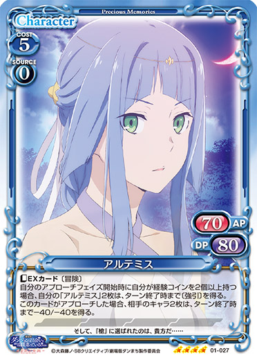 | 〔EXカード〕自分が経験コインを5個以上持つ状態で、同じターンの間に、自分の「アルテミス」の退場判定で相手のキャラが2枚以上退場した場合、相手に1ポイント与える。その場合、カードを1枚引く。 | ||