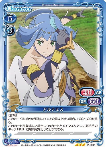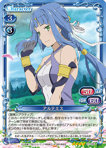 | 〔EXカード〕〔冒険〕自分のアプローチフェイズ開始時に自分が経験コインを2個以上持つ場合、自分の「アルテミス」2枚は、ターン終了時まで〔強引〕を得る。このカードがアプローチした場合、相手のキャラ2枚は、ターン終了時まで-40/-40を得る。 | ||