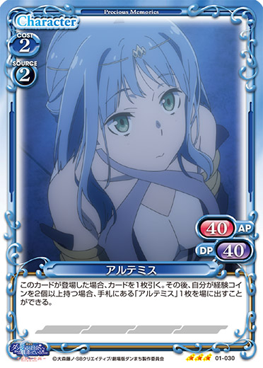 | このカードが登場した場合、カードを1枚引く。その後、自分が経験コインを2個以上持つ場合、手札にある「アルテミス」1枚を場に出すことができる。 | ||