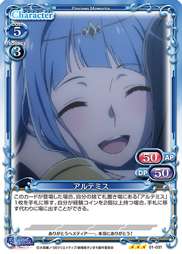| このカードが登場した場合、自分の捨て札置き場にある「アルテミス」1枚を手札に移す。自分が経験コインを2個以上持つ場合、手札に移す代わりに場に出すことができる。 | ||
