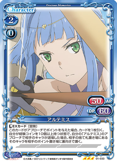 | 〔EXカード〕〔冒険〕このカードがアプローチでポイントを与えた場合、カードを1枚引く。自分が経験コインを10個以上持つ状態で、自分の「アルテミス」のアプローチで相手のキャラが退場した場合、相手の捨て札置き場にあるそのキャラを相手のポイント置き場に裏向きで置く。 | ||