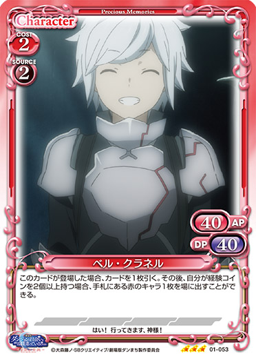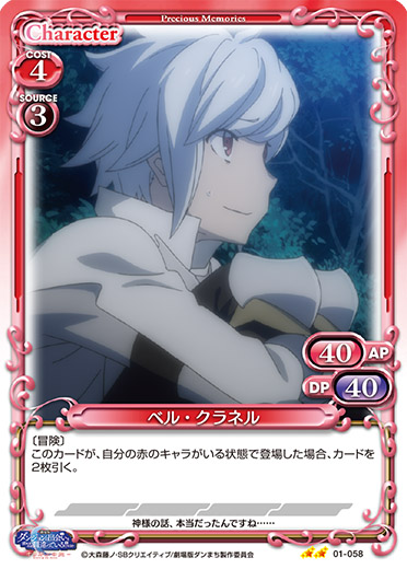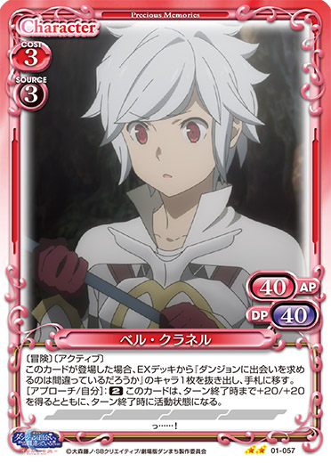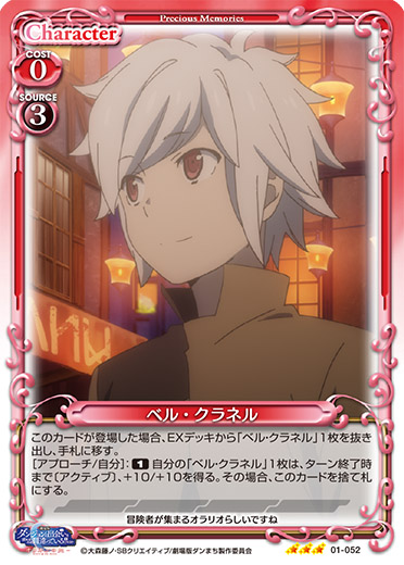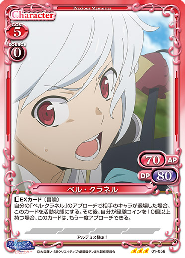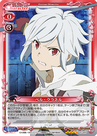 | 〔EXカード〕〔冒険〕自分の「ベル・クラネル」のアプローチで相手のキャラが退場した場合、このカードを活動状態にする。その後、自分が経験コインを10個以上持つ場合、このカードは、もう一度アプローチできる。 | ||