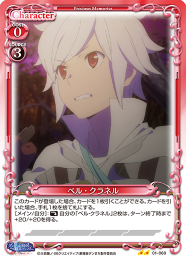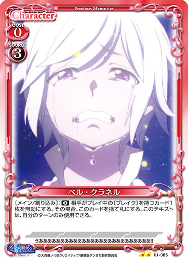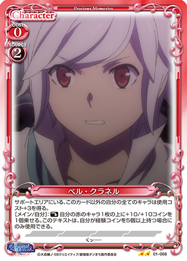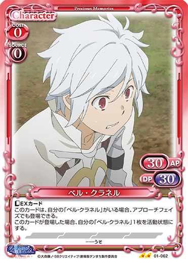 | 〔EXカード〕このカードは、自分の「ベル・クラネル」がいる場合、アプローチフェイズでも登場できる。このカードが登場した場合、自分の「ベル・クラネル」1枚を活動状態にする。 | ||