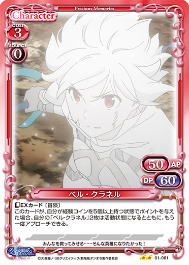 | 〔EXカード〕〔冒険〕このカードが、自分が経験コインを5個以上持つ状態でポイントを与えた場合、自分の「ベル・クラネル」2枚は活動状態になるとともに、もう一度アプローチできる。 | ||