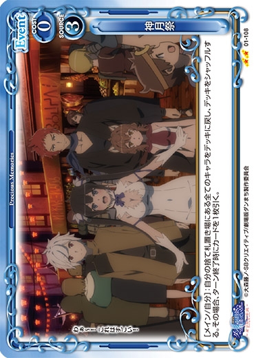 | [メイン/自分]:自分の捨て札置き場にある全てのキャラをデッキに戻し、デッキをシャッフルする。その場合、ターン終了時にカードを1枚引く。 | ||