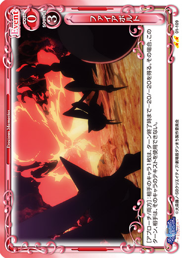 | [アプローチ/両方]:相手のキャラ1枚は、ターン終了時まで-20/-20を得る。その場合、このターン、相手は、そのキャラのテキストを使用できない。 | ||